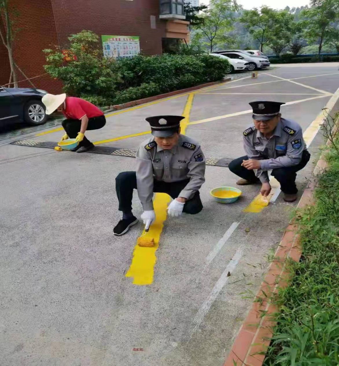 (圖為物業(yè)工作人員劃停車線、消防通道線)